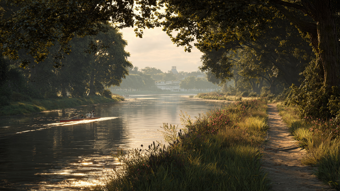 Create a photorealistic, high-resolution image of a peaceful stretch of the River Thames between Richmond and Kew during early morning light. The camera should be positioned at ground level on a narrow riverside path with soft grass and natural earth tones in the foreground. The river should curve gently through the scene, reflecting pale golden sunlight and light mist rising from the water. On one side, include overhanging trees with lush green foliage forming a partial canopy above the path. In the distance, show a small rowing boat gliding smoothly across the river with subtle ripples trailing behind it. No modern skyscrapers should be visible. The mood should feel calm, spacious, and restorative, emphasizing nature within London. Include one or two distant walkers moving away from the camera, naturally blended into the scene. No text or overlays. Non-animated, realistic travel photography style, soft natural lighting, detailed textures, balanced exposure, serene color grading.
