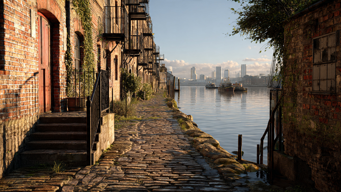 Create a photorealistic, high-resolution image of a quiet, lesser-known stretch of the River Thames in London during soft late-afternoon light. The camera should be positioned at eye level on a narrow riverside path with old brick warehouse buildings on one side and the calm river on the other. The walkway should feel slightly hidden and peaceful, with subtle textures like aged brick, metal railings, and weathered stone. Include gentle reflections of the buildings in the water and a light breeze creating small ripples. Only one or two distant walkers should appear naturally in the frame, moving away from the camera to emphasize quietness. The skyline should not dominate the scene, and no iconic landmarks should be immediately recognizable. The mood should feel understated, authentic, and slightly nostalgic. No text overlays. Non-animated, realistic travel photography style, natural lighting, balanced contrast, detailed textures, calm color grading.