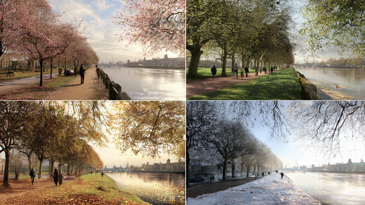 Bottom right: Winter scene with bare trees, crisp cool light, and a slightly misty atmosphere over the river with fewer walkers.