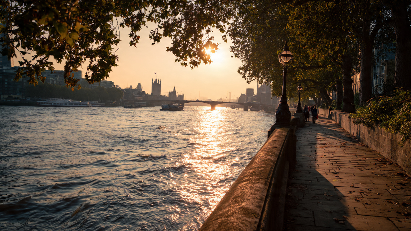 Create a photorealistic wide-angle image of a peaceful riverside walkway along the River Thames in London during golden hour. The camera angle should be slightly elevated, looking diagonally along the river path so the walkway leads naturally into the distance. Include soft warm sunlight reflecting off the water, gentle ripples on the river surface, and a few casually dressed people walking in the distance without facing the camera. On the horizon, include a recognizable London skyline silhouette with one historic bridge visible but not dominating the frame. Add trees lining one side of the walkway with subtle autumn tones. The composition should feel calm, spacious, and inviting, with no text or overlays. The image must look realistic, natural lighting, professional travel photography style, high detail, high resolution, non-animated, balanced contrast, and natural color grading.