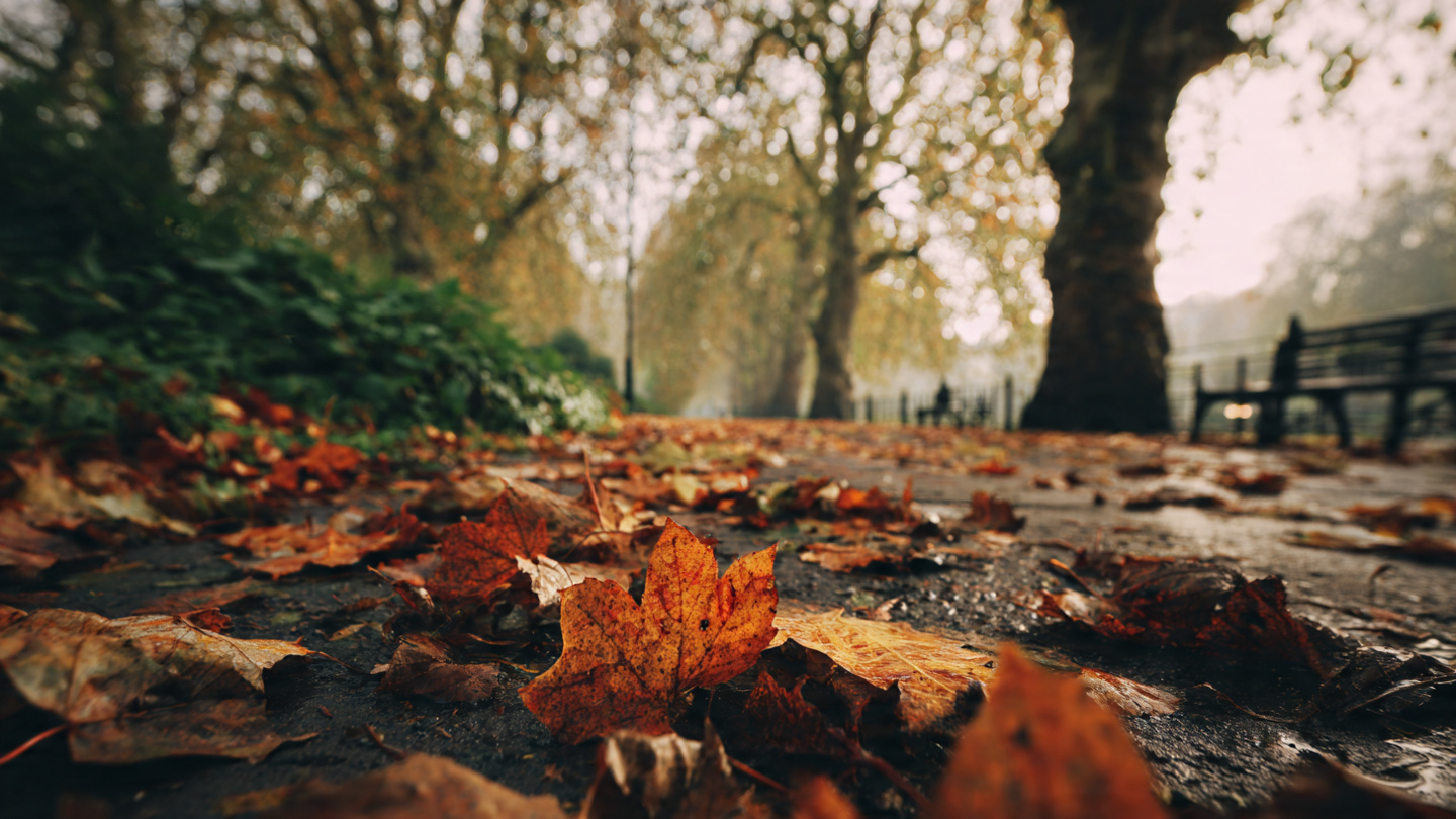 Things to do in London in autumn, misty park pathway with fallen leaves and empty bench at sunrise, showcasing peaceful fall scenery and reflective seasonal experiences in London