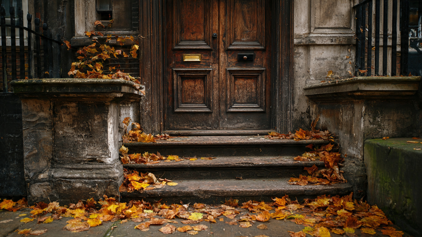 Things to do in London in autumn, quiet residential street covered with fallen leaves and a lone walker in the distance, capturing peaceful fall walks and seasonal city experiences in London