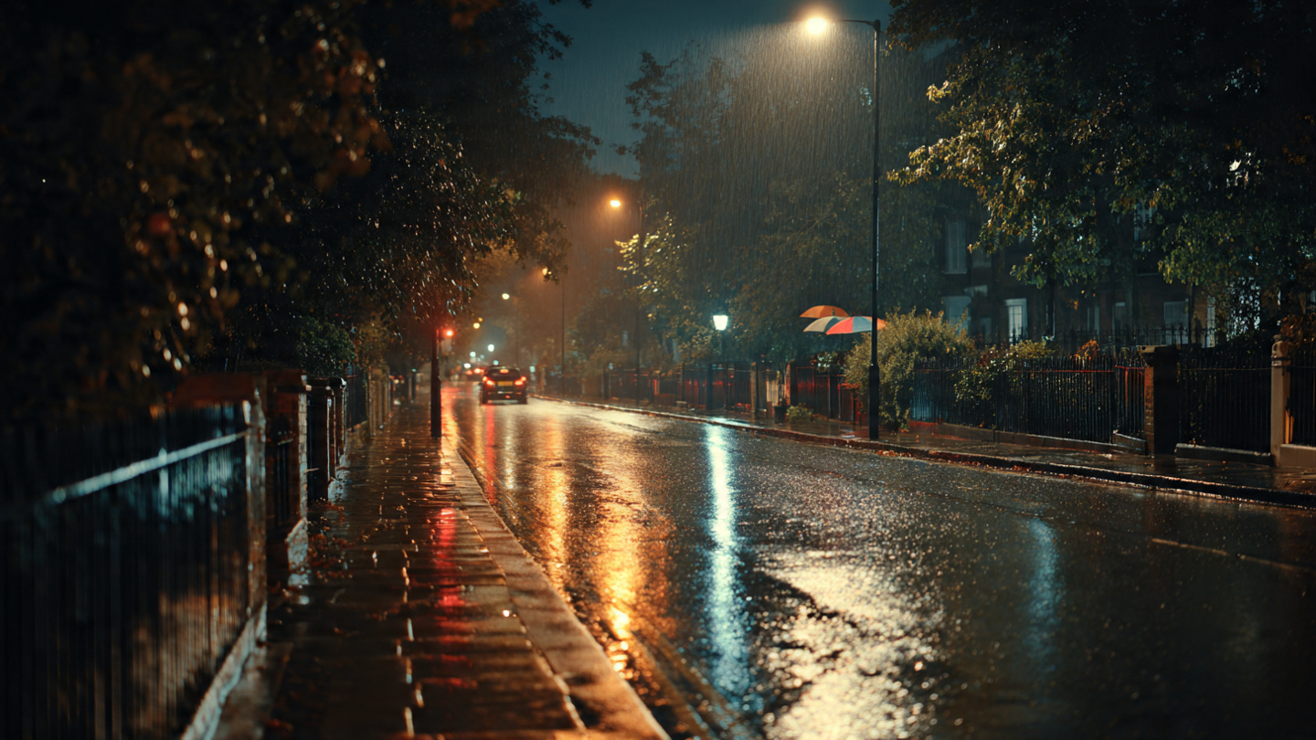 Things to do in London in autumn, peaceful autumn evening walk along a historic London street with wet pavement, glowing streetlights, fallen leaves, and calm seasonal city atmosphere