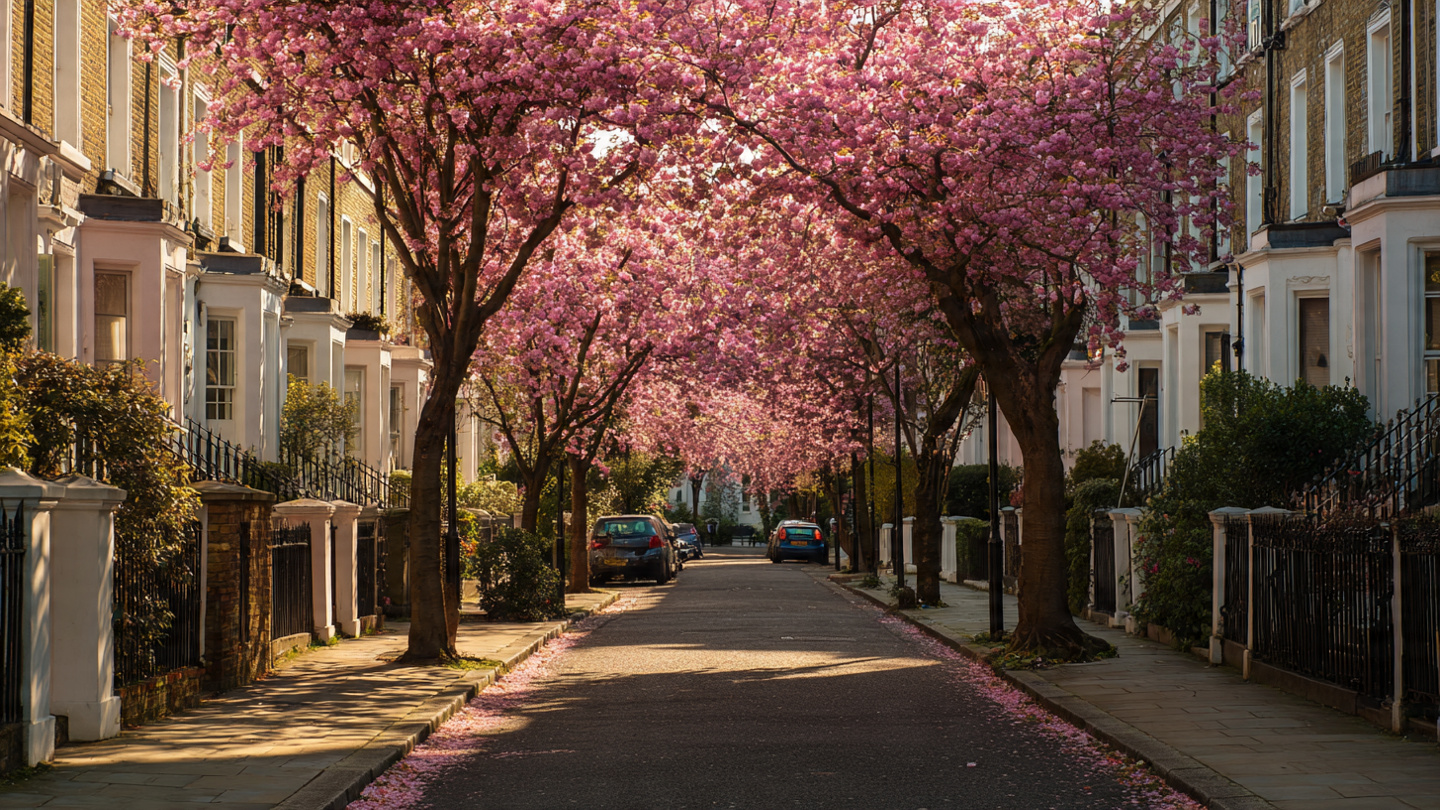 Quiet historic London street in spring with blooming trees and warm sunlight, showing scenic walking routes, neighborhood exploration, and relaxed sightseeing among the best things to do in London in spring.